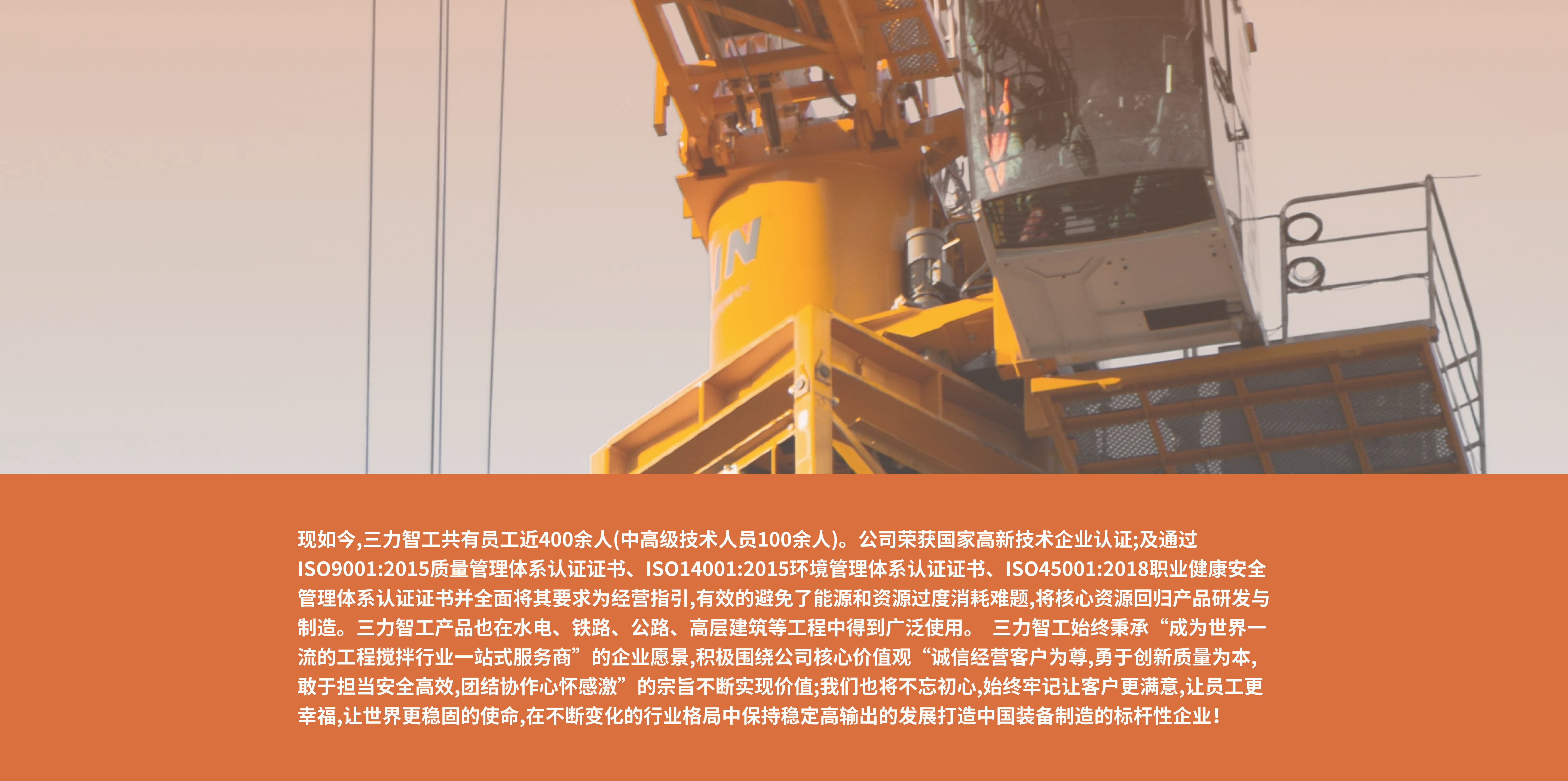湖南三力智工機(jī)械股份有限公司成立于1995年,是湖南省建筑機(jī)械行業(yè)規(guī)模較大,是集研發(fā)、設(shè)計(jì)、生產(chǎn)、銷(xiāo)售、安裝、售后服務(wù)為一體的專(zhuān)業(yè)性機(jī)械龍頭企業(yè)。公司主要銷(xiāo)售產(chǎn)品為混凝土攪拌站、穩(wěn)定土拌合站、混凝土路面施工機(jī)械、混凝土環(huán)保設(shè)備、破碎制砂設(shè)備、制砂樓等成套專(zhuān)業(yè)機(jī)械設(shè)備。公司總部設(shè)于長(zhǎng)沙市寧鄉(xiāng)高新區(qū)程機(jī)械配套產(chǎn)業(yè)園,廠(chǎng)區(qū)占地面積58000余平方米。三力智工現(xiàn)共有員工近400余人。有國(guó)內(nèi)先進(jìn)的鑄造中心、行業(yè)高效的機(jī)加工、裝試生產(chǎn)線(xiàn),各類(lèi)機(jī)械加工設(shè)備、檢測(cè)設(shè)備100余臺(tái)。